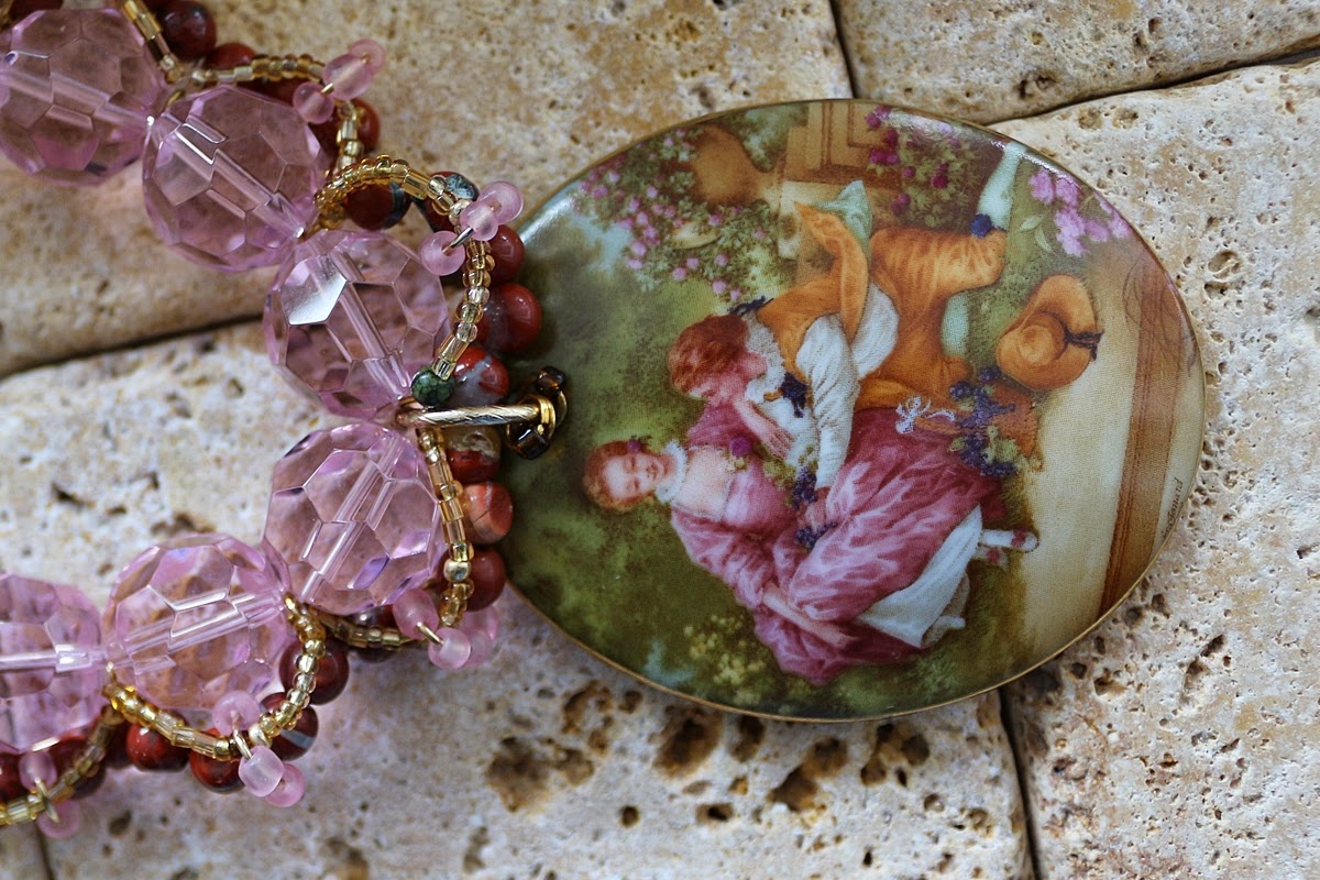 collana lavorata a mano con agate, perline di vetro e plastica, cristalli, catenine in metallo e porcellana Limoges...